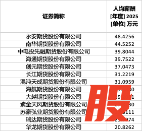 在披露了2025年人均薪酬数据的公司中,永安期货以48.43万元的高薪高居榜首。南华期货以44.53万元位列第二,中电投先融期货(39.80万元)、海通期货(39.75万元)、创元期货(37.05万元)紧随其后。
