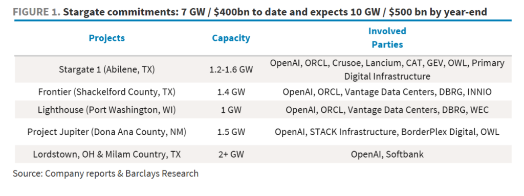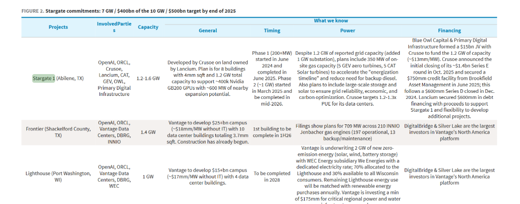 OpenAI与Stargate项目:该项目计划到2025年底实现10吉瓦、5000亿美元的投资目标。目前已承诺约7吉瓦容量,分布在德克萨斯州、威斯康星州等地,其合作伙伴包括甲骨文、和数据中心开发商Vantage、Crusoe等。